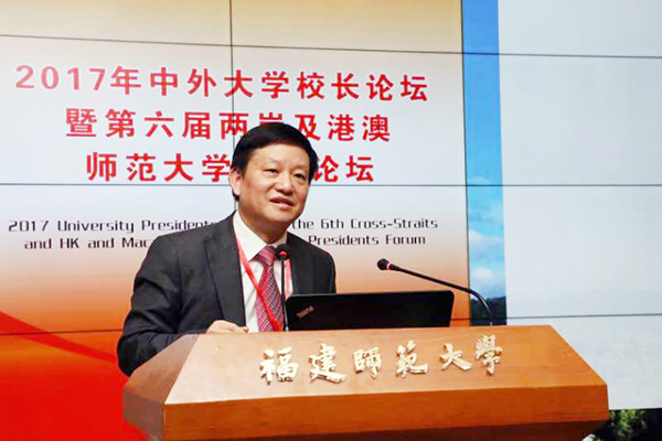 (供稿 校长办公室)11月17日,2017年中外大学校长论坛暨第六届海峡两岸及港澳师范大学校长论坛在福建师范大学举行。我校校长蒋洪新出席论坛,作了题为《学科建设要树立一流思维》的主旨发言。